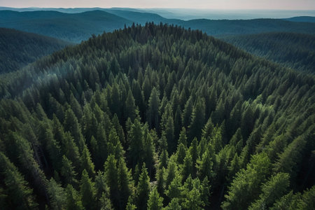 An overhead view reveals a dense forest, dominated by evergreen trees in various shades of green. The composition highlights the texture of the foliage and its layered arrangement. The style suggests a natural environment suitable for environmental concepts or background use, conveying a sense of serenity.