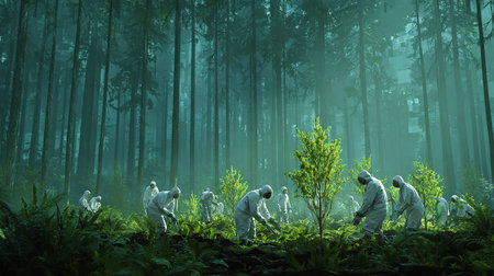 Diverse team of lumberjacks working with machinery in a misty forest