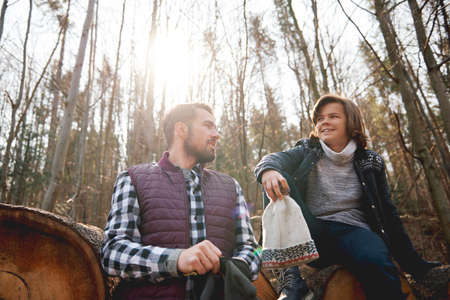 Father and his teenage son in autumn forest