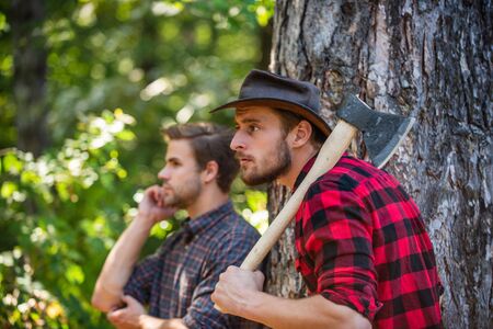 Enjoying summer. ranger or poach. man forester use saw and axe. search firewood for picnic campfire. Surviving in wild nature. human and nature. men hiking in wood. poachers in forest. deforestation
