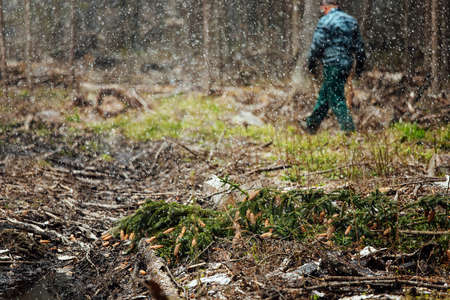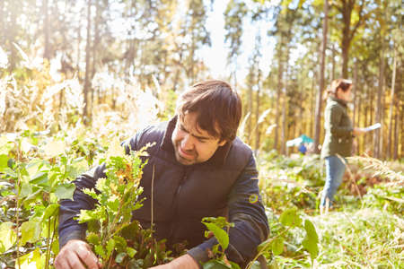 Forestry or forest worker at the pine tree plant for nature conservation