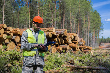 Forestry technician using digital tablet computer in forest for logging data collecting during deforestation