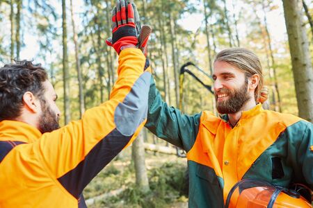 Two forest workers motivate themselves with a high five after the harvest
