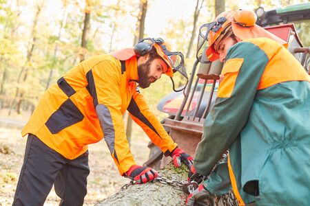 Men walking in the forest holding a chainsaw and garden tools. Lumberjacks at work wears orange personal protective equipment. Gardeners working outdoor in the forest. Security forestry worker concept