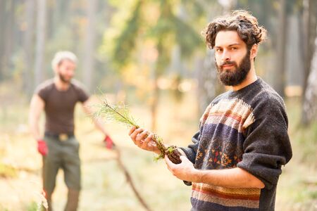 Young forest worker or forest ranger with pine seedling for sustainable afforestation