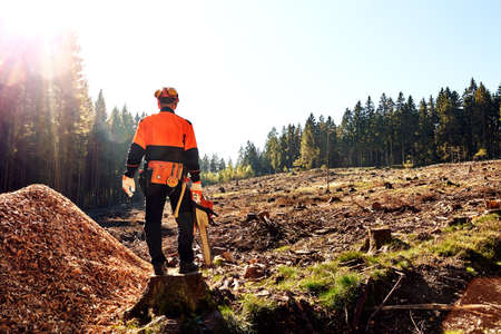 Professional lumberjack with protective workwear and chainsaw working in a forest