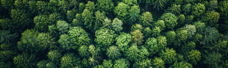 An overhead view reveals a dense forest canopy composed of numerous tall evergreen trees. The scene showcases a variety of green hues, with textures of needles and branches. The composition is framed by subdued lighting. The image suits commercial and editorial applications to depict nature or environment.