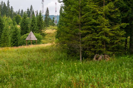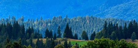 Summer landscape in Romania. Distant mountain range and thin layer of fog on the valleys. Coniferous forest and small houses on hillsides in the Eastern Carpathians.