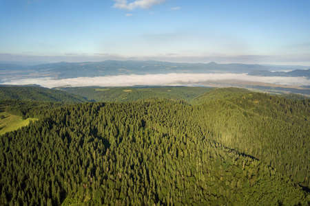 Aerial view of green mountain hills covered with evergreen spruce forest in summer.