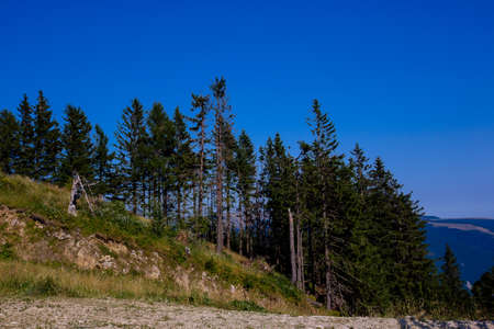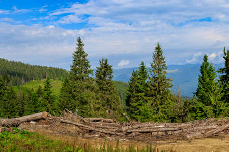 beautiful green pine forest in the Carpathians front lawn with cut down trees on a sunny day, front view the average plan