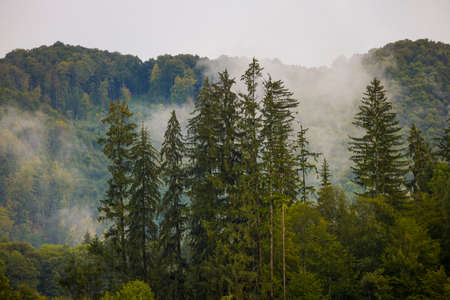 a landscape of the spruce forest at carpathian mountains, national park Skolivski beskidy, Lviv region of Western Ukraine