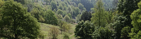 Spring landscape with mixed forest on a hill, coniferous trees and deciduous growth together in the forest Schwarzwald