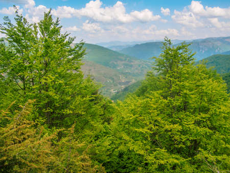 Evergreen spring forest with tall fresh thorny fir trees and various flowering small mountain vegetation on slope of small low wild hill, in Rhodope Mountains against background of blue cloudy sky