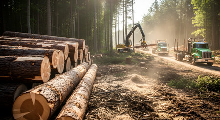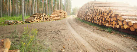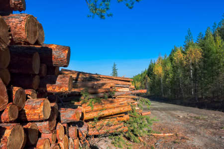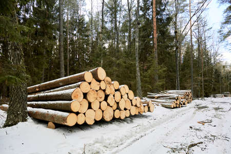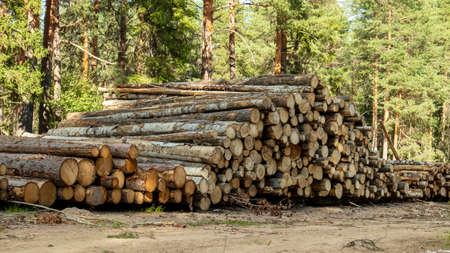 A wood material logging. Round timber stock. Lumber-camp of pine. Mass deforestation. Freshly cut tree logs piled up. Harvesting of wood. Sale of natural resources on the exchange. Ecological problem.