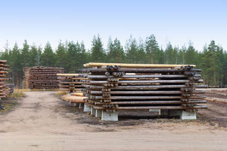 pine logs are stacked in a woodyard before processing or transportation