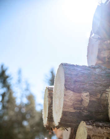 Freshly made firewood in the evergreen forest, pine tree logs close-up. Environmental damage, ecological issues, ecology, nature, wood, deforestation, alternative energy, lumber industry, business