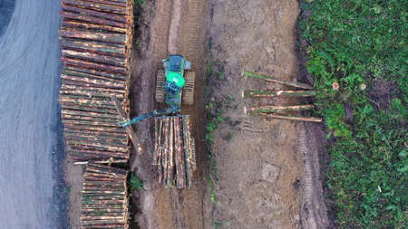 Newly felled timber logs being moved from a large transportation truck with aerial view