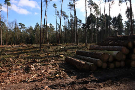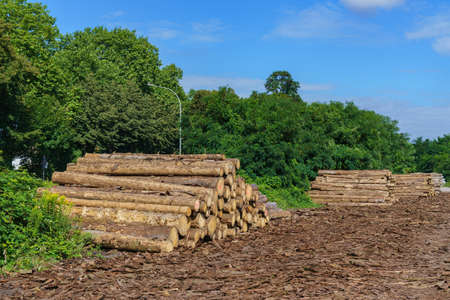 Piles of lumbers by pathway in the forests of Luneberg Heide Woodland
