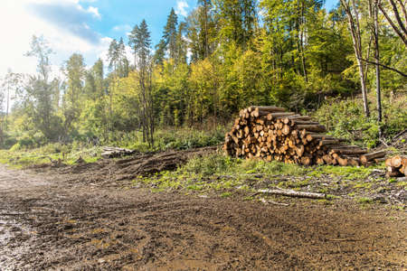 Wood pile in the forest near logging road or path at sunrise in the Czech Republic. Logging.