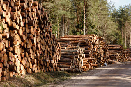 Woodpile of freshly harvested pine logs on a forest road. Trunks of trees cut and stacked in the foreground, forest in the background. Wood patern background. Ecological problem.