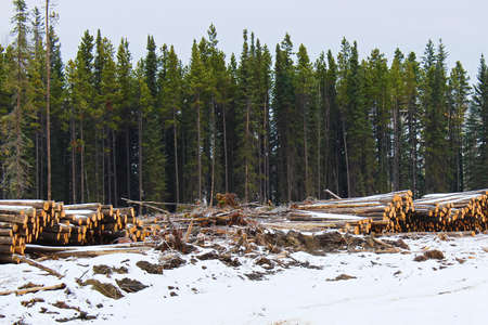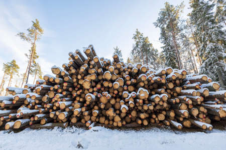 A wood material logging. Round timber stock. Lumber-camp of pine. Mass deforestation. Freshly cut tree logs piled up. Harvesting of wood. Sale of natural resources on the exchange. Ecological problem.