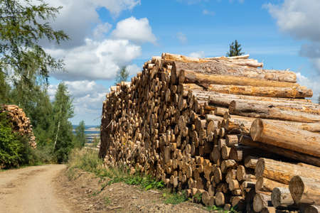 Piled logs of harvested wood timber next to forest. Czech Republic Bark beetle attack calamity deforestation, European landscape