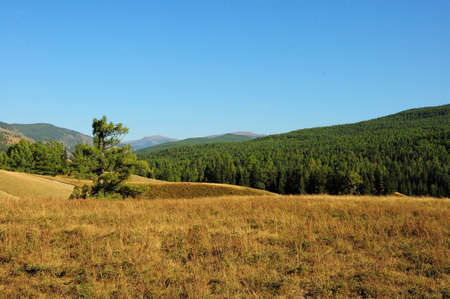 A small pine tree on the slope of a high hill surrounded by mountains covered with coniferous forest. Ulagan plateau, Altai, Siberia, Russia.