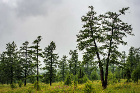 Landscape with coniferous forest. Sparse trees, foggy weather