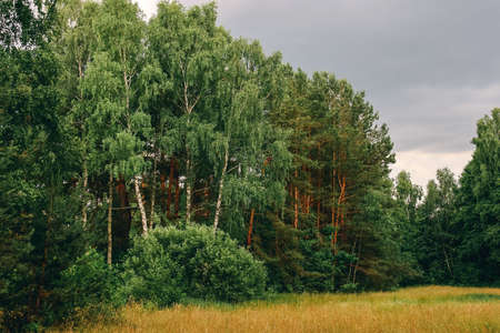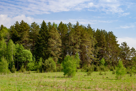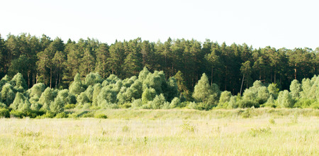 Landscape with meadow and mixed coniferous and deciduous forest, summer day