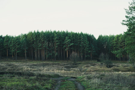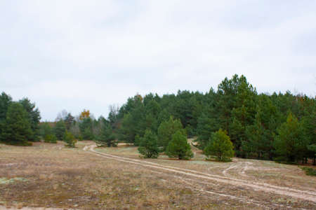 Autumn Russian pine forest in cloudy weather, landscape.