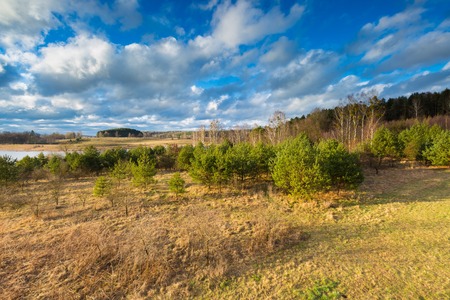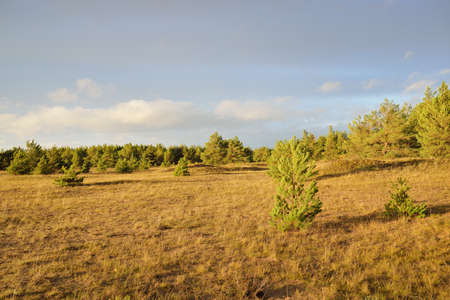Growing young pine trees, evergreen forest. Dramatic sky. Idyllic landscape. Baltic nature. Ecology, environmental conservation, deforestation, reforestation themes