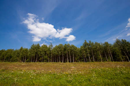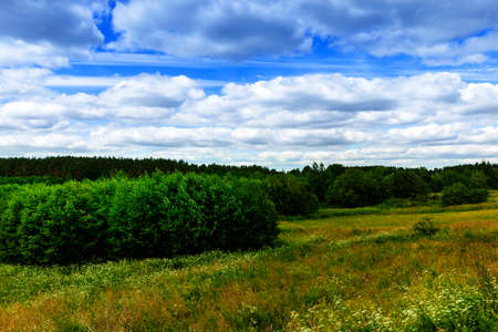summer field, forest on the horizon and clouds in the sky