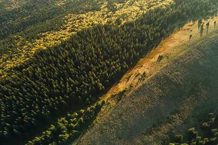 Aerial view of dark mixed pine and lush forest with green and yellow trees canopies in autumn mountain woods