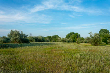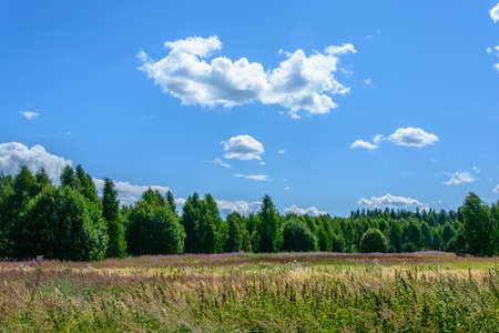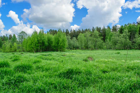 Summer landscape. Green forest, large meadow with grass in the foreground. Bright blue sky in summer over the forest. Summer mood, copy space.