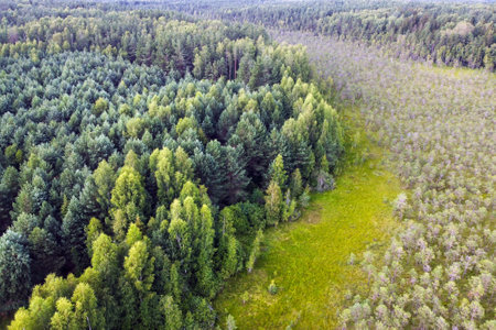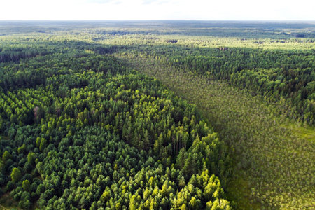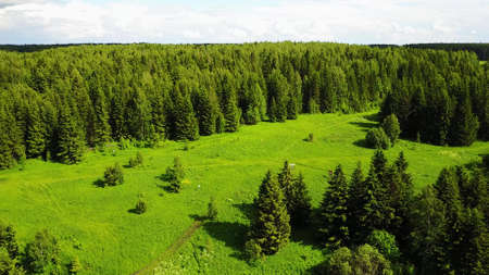 Aerial view of summer forest. Aerial landscape with green coniferous trees, top view