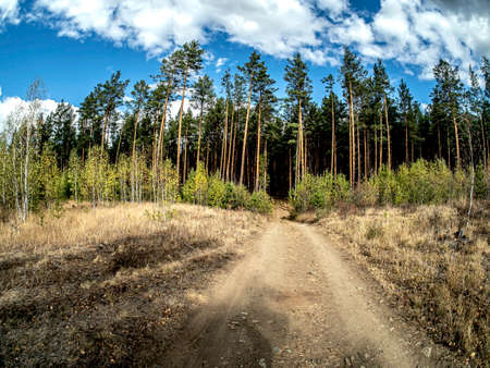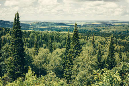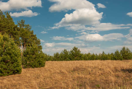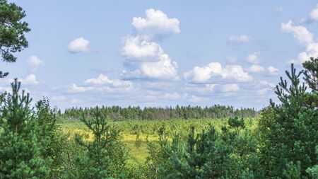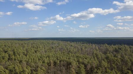Coniferous, green forest and clear, blue sky with white clouds. Beautiful autumn landscape.