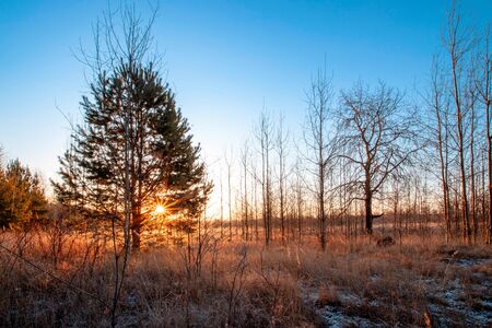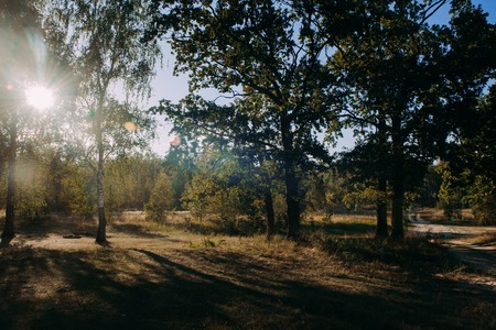 scenery photography. Beautiful sunset, trees in the autumn forest, bright landscape, landscape in the autumn season.