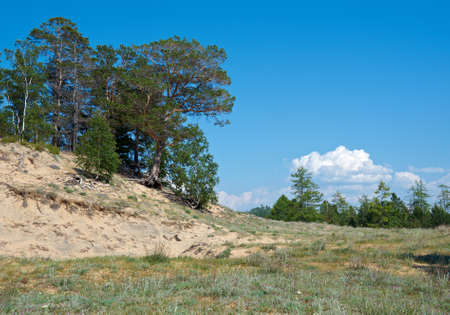 A lonely little pine tree on a hill against the background of the lake in summer Sunny day