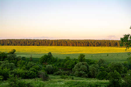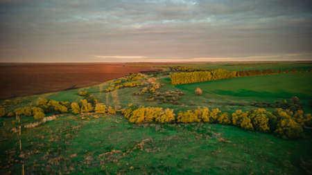 Agricultural crop field. Forest in the background. Soft golden sunlight. Rural scene. Countryside, farm and food industry, seeds, plantation, irrigation themes