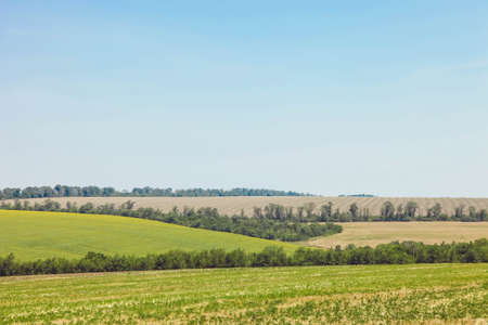 Green fields against the blue sky. Agriculture, landscape.