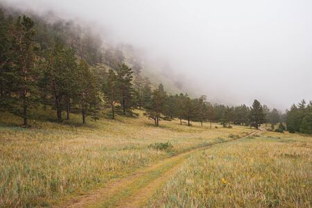 The trail next to the mountain in dense fog through the spruce. Green grass on the ground. Morning. Cloudy weather.