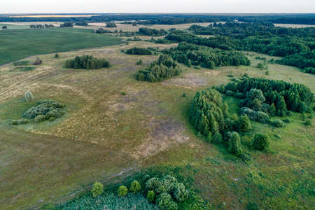 Beautiful landscape photographed from above (from tall observation tower). Early spring meadow with forest under blue sky with clouds. Tranquil scene.