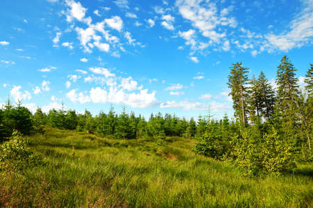 Spring landscape in Sumava National Park. Meadow with spruce trees on Pancir mountain, Czech Republic.