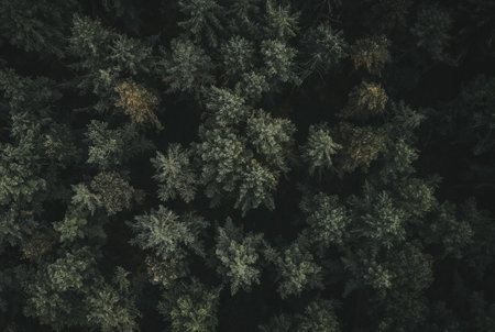 An overhead view reveals a dense forest canopy composed of numerous tall evergreen trees. The scene showcases a variety of green hues, with textures of needles and branches. The composition is framed by subdued lighting. The image suits commercial and editorial applications to depict nature or environment.