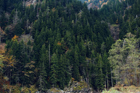 Pine forest in the mountains. Autumn nature.