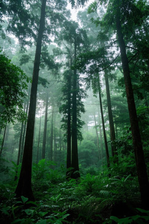 Experience the calming beauty of a misty forest landscape, featuring tall trees and rich greenery that creates a peaceful atmosphere for nature lovers and photographers.