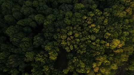 Aerial top view pine forest. Texture of coniferous forest view from above. Green background nature. Picture taken using drone.
