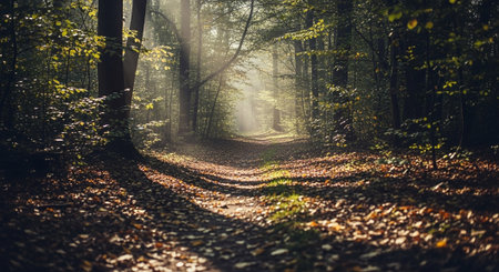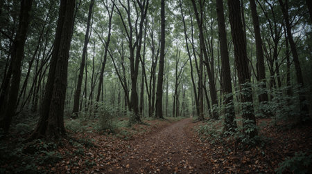 Serene dirt path meanders through dense deciduous forest with towering trees and lush undergrowth. Atmospheric lighting creates mystical mood perfect for nature, wellness, adventure