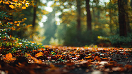 A beautiful autumn scene showcasing a tranquil forest pathway covered with colorful fallen leaves. Ideal for nature lovers and outdoor enthusiasts.