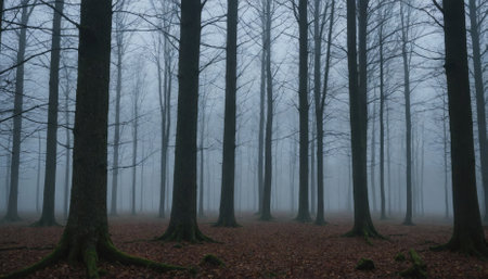 A mystical forest scene enveloped in ethereal mist, creating a sense of mystery and enchantment